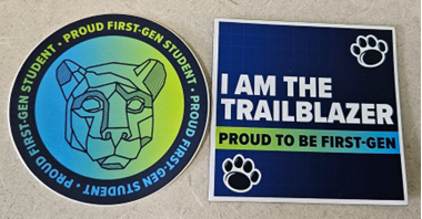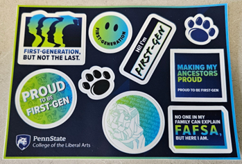 Caption: Penn State first-generation student merchandise, including a sticker sheet, individual stickers and a button.